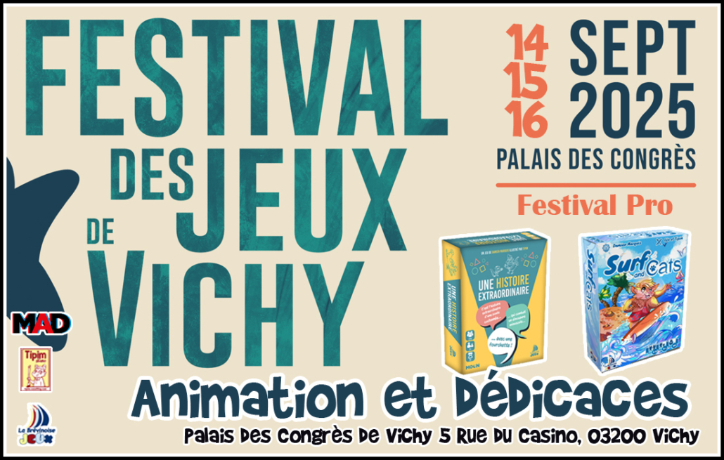 Nous seront présent avec notre auteur Damien Marquis à Vichy (03) pour le festival pro des Jeux ces dimanche, lundi et mardi 14,15 et 16 Septembre 2025 de 10h00 à 18h00, pour une Animation et Dédicaces des jeux Une Histoire Extraordinaire et Surf and Cats.