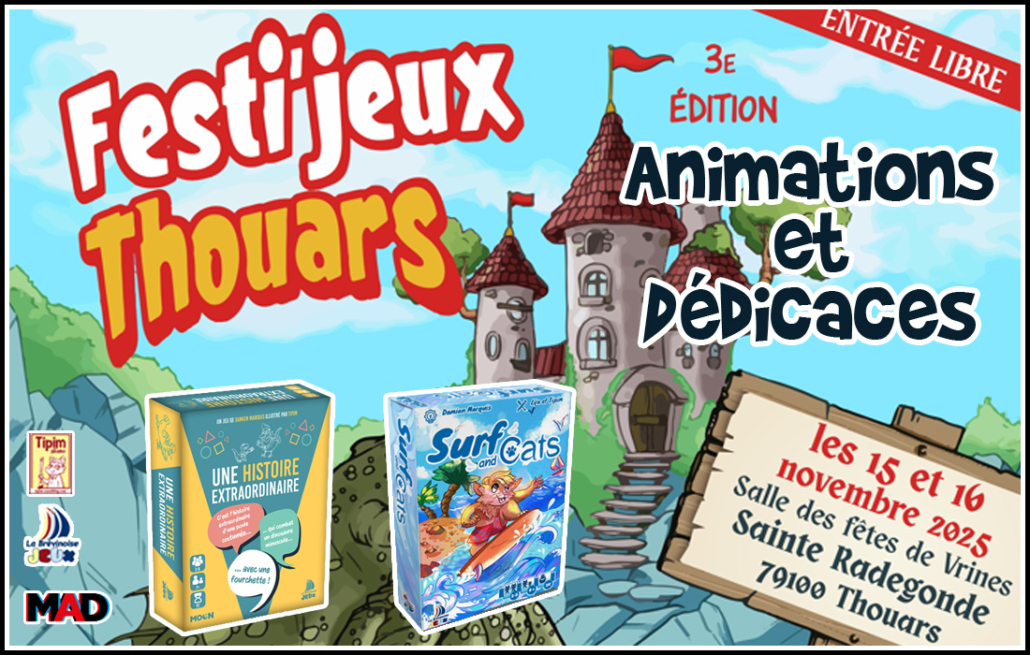 Nous seront présent avec notre auteur Damien Marquis à Thouars (79) au Festi’Jeux ces samedi 15 et dimanche 16 novembre 2025 de 10H00 à 18h00 pour des animations et dédicaces des jeux Une Histoire Extraordinaire et Surf and Cats.