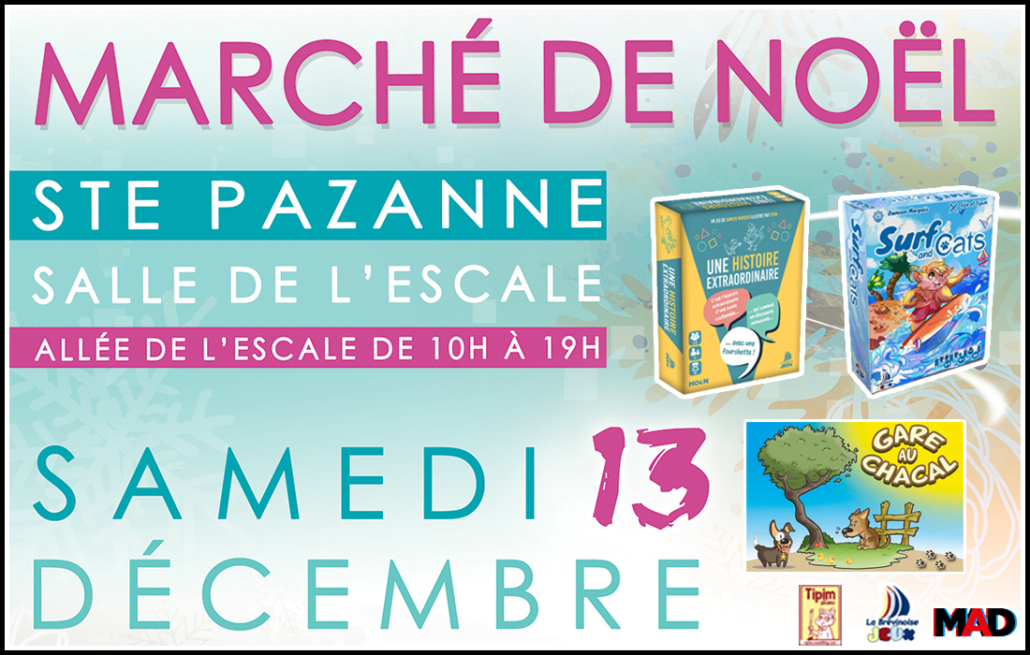 Nous seront présent avec notre auteur Damien Marquis à St Mars de Coutais puis Ste Pazanne (79) sur leurs Marché de Noël respectifs ces vendredi 12 et samedi 13 ndécembre 2025 de 10H00 à 18h00 pour des animations et dédicaces des jeux Une Histoire Extraordinaire et Surf and Cats.